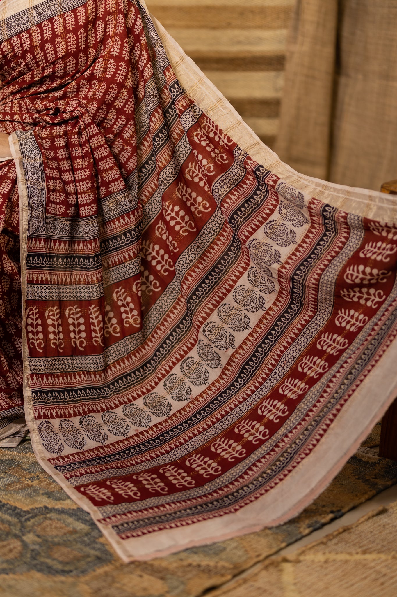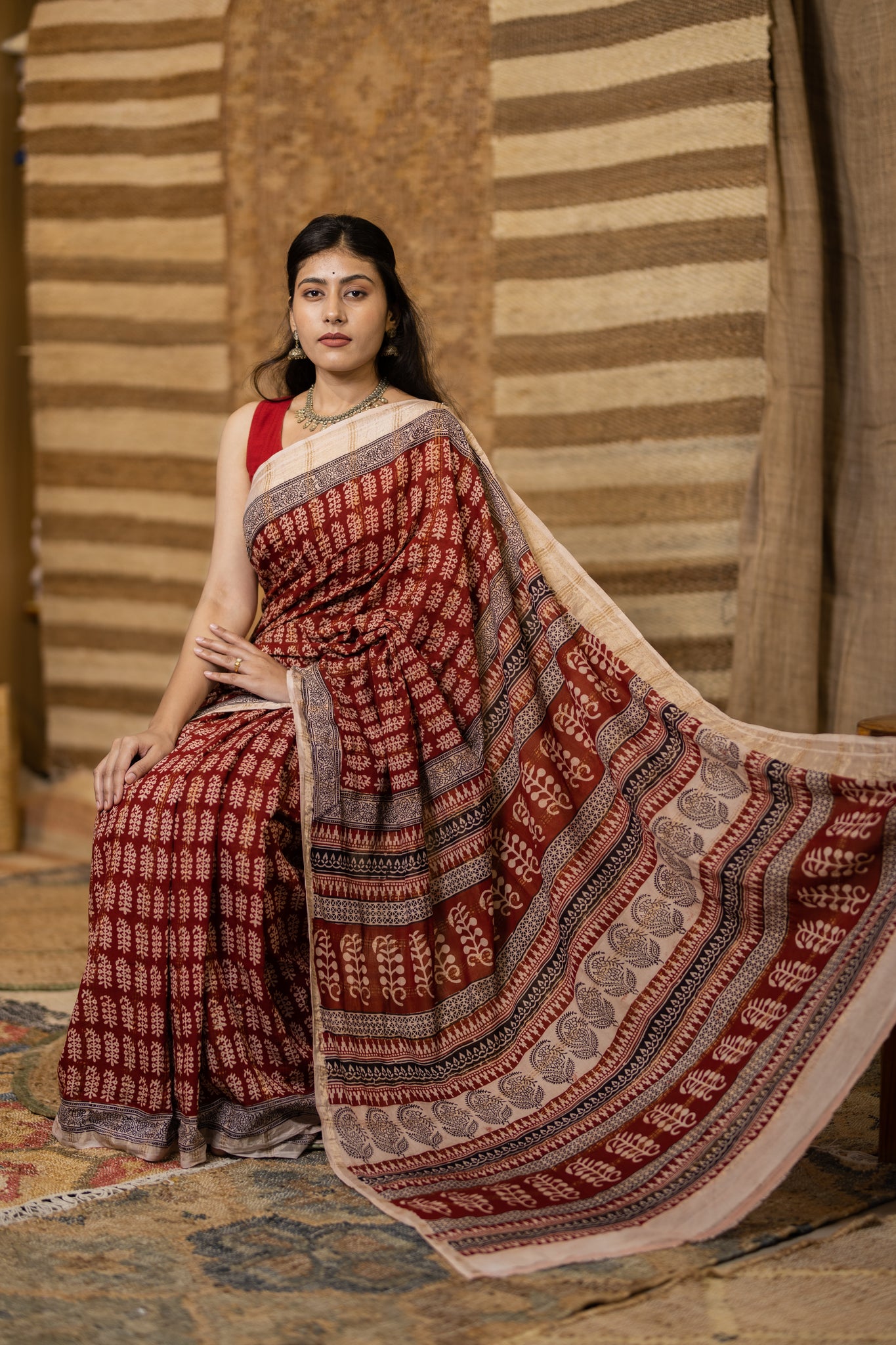 Baghmati is purely handwoven cotton saree on handloom. This saree is uniquely handcrafted in traditional bagh hand block printing technique near bank of river narmada. The colours used in this printing is purely natural & organic.