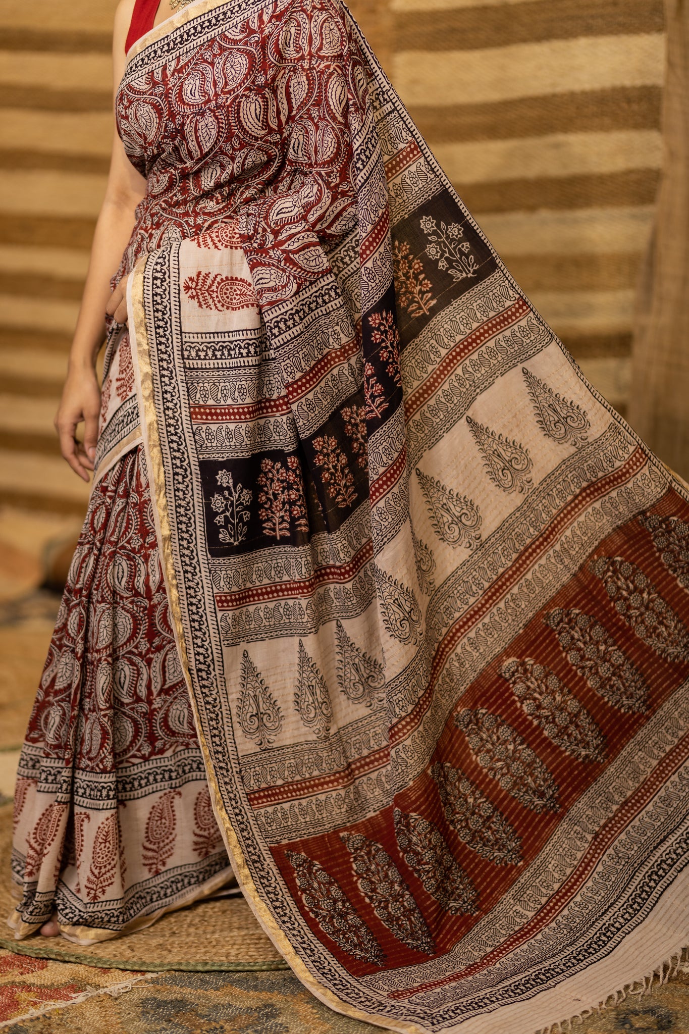 Baghmati is purely handwoven cotton saree on handloom. This saree is uniquely handcrafted in traditional bagh hand block printing technique near bank of river narmada. The colours used in this printing is purely natural & organic.