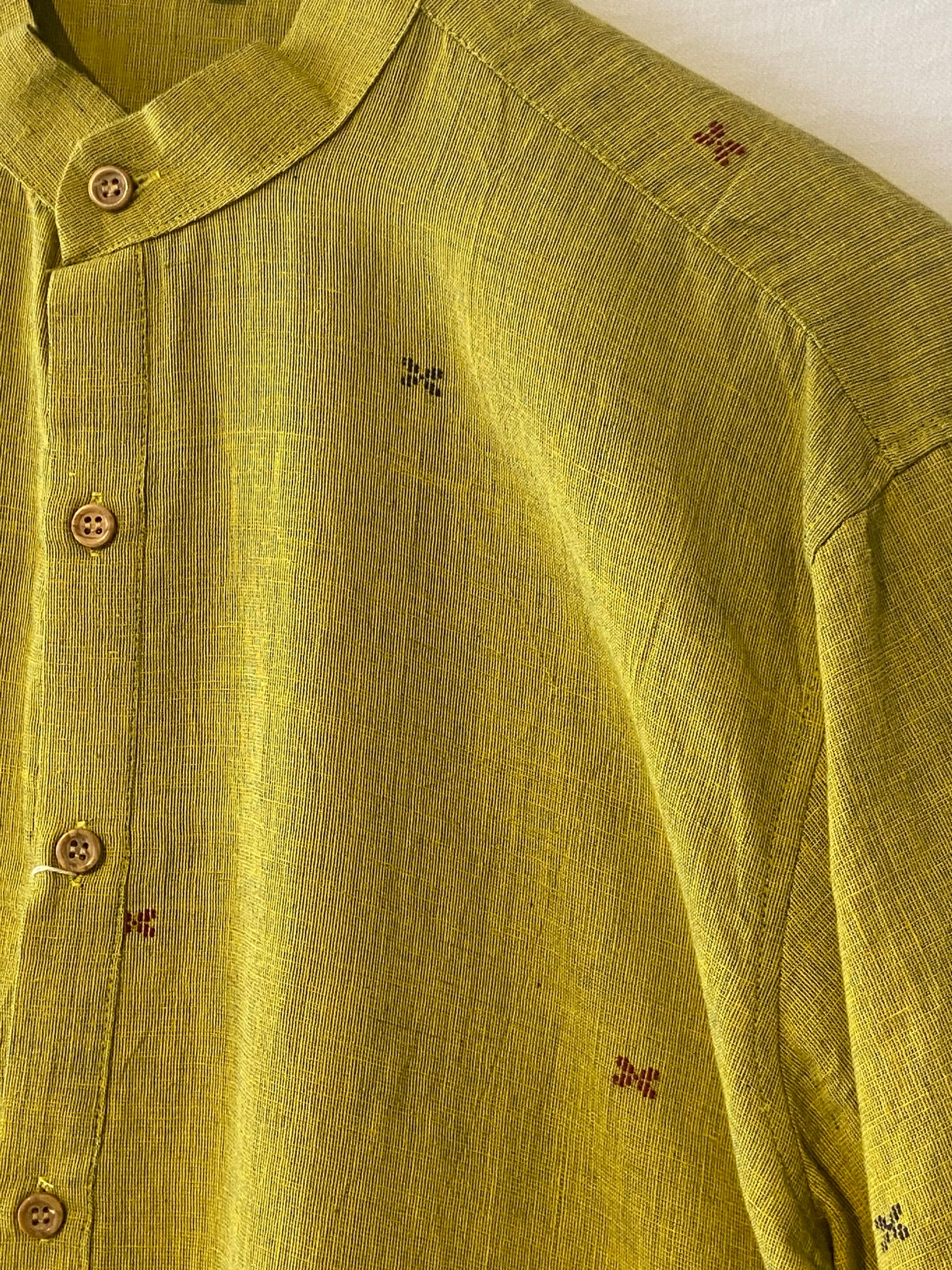 HAND WOVEN ON HANDLOOM LINEN BY LINEN YARN IS USED TO HAND CRAFT . THE FABRICS HAND BOOTI DESIGN IS USED AS AN ADDITIONAL ART TO CRAFT THE FABRIC.