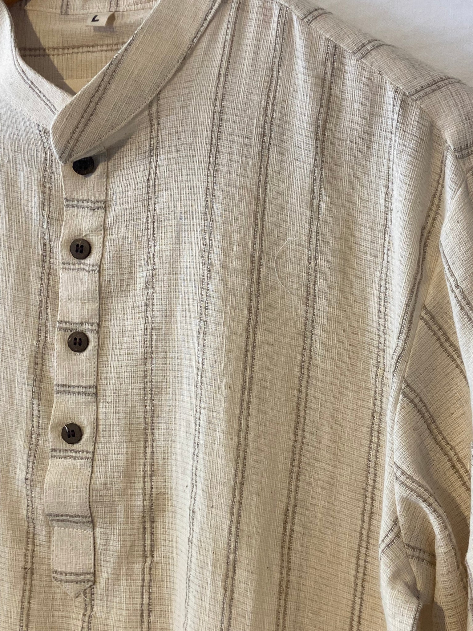 HAND SPUN COTTON YARN IS USED TO HAND WEAVE THE KHADI FABRIC ON TRADITIONAL HANDLOOM. THE NATURAL JUTE LINEN YARN IS USED TO GIVE THE STRIPES AS AN ADDITIONAL EFFECT.