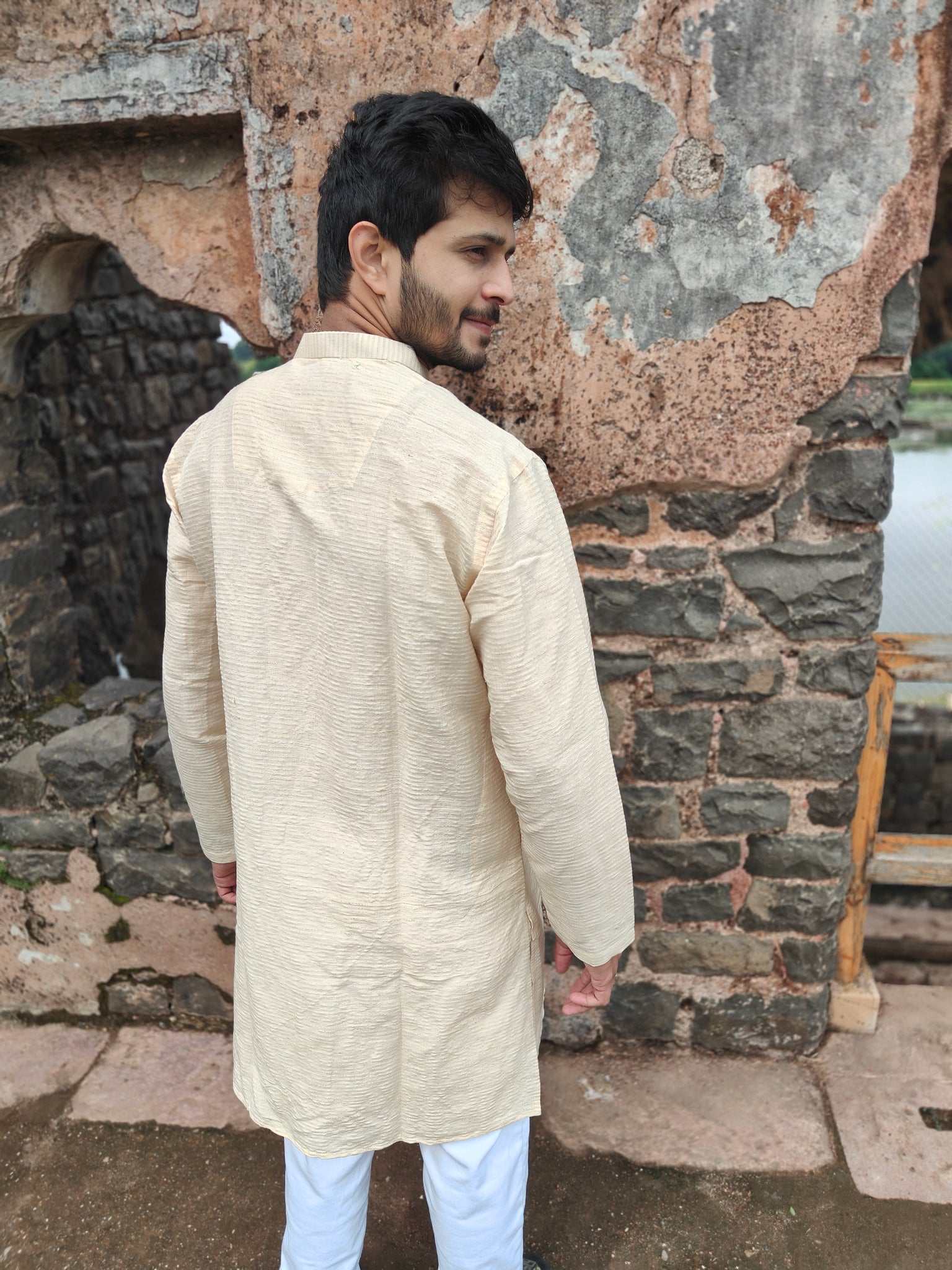 This hand crafted fabric is hand woven on handloom using natural fiber yarn of cotton and linen. This has rich texture and lustre of linen yarn used as vertical stripes in weft with cotton.