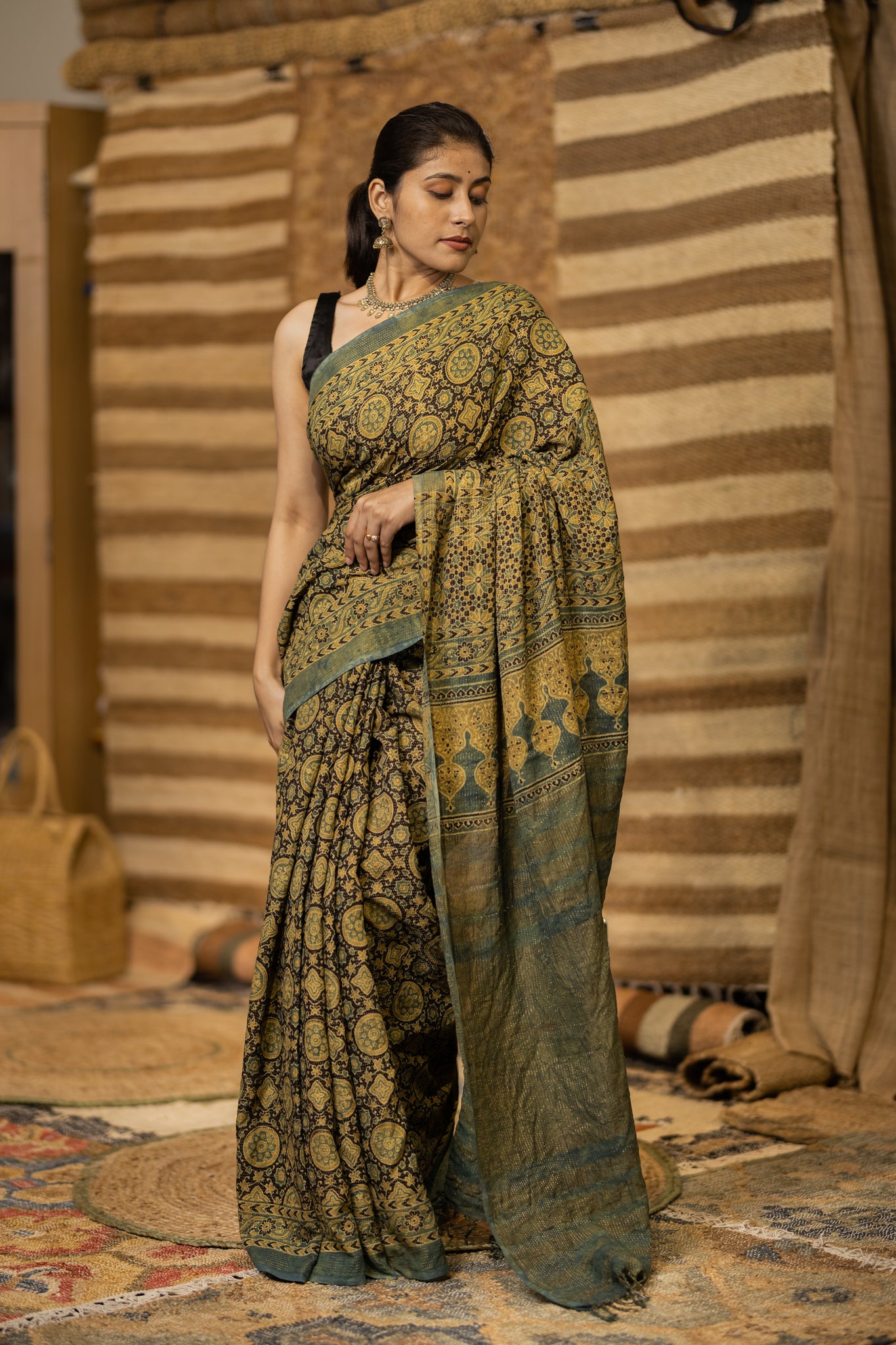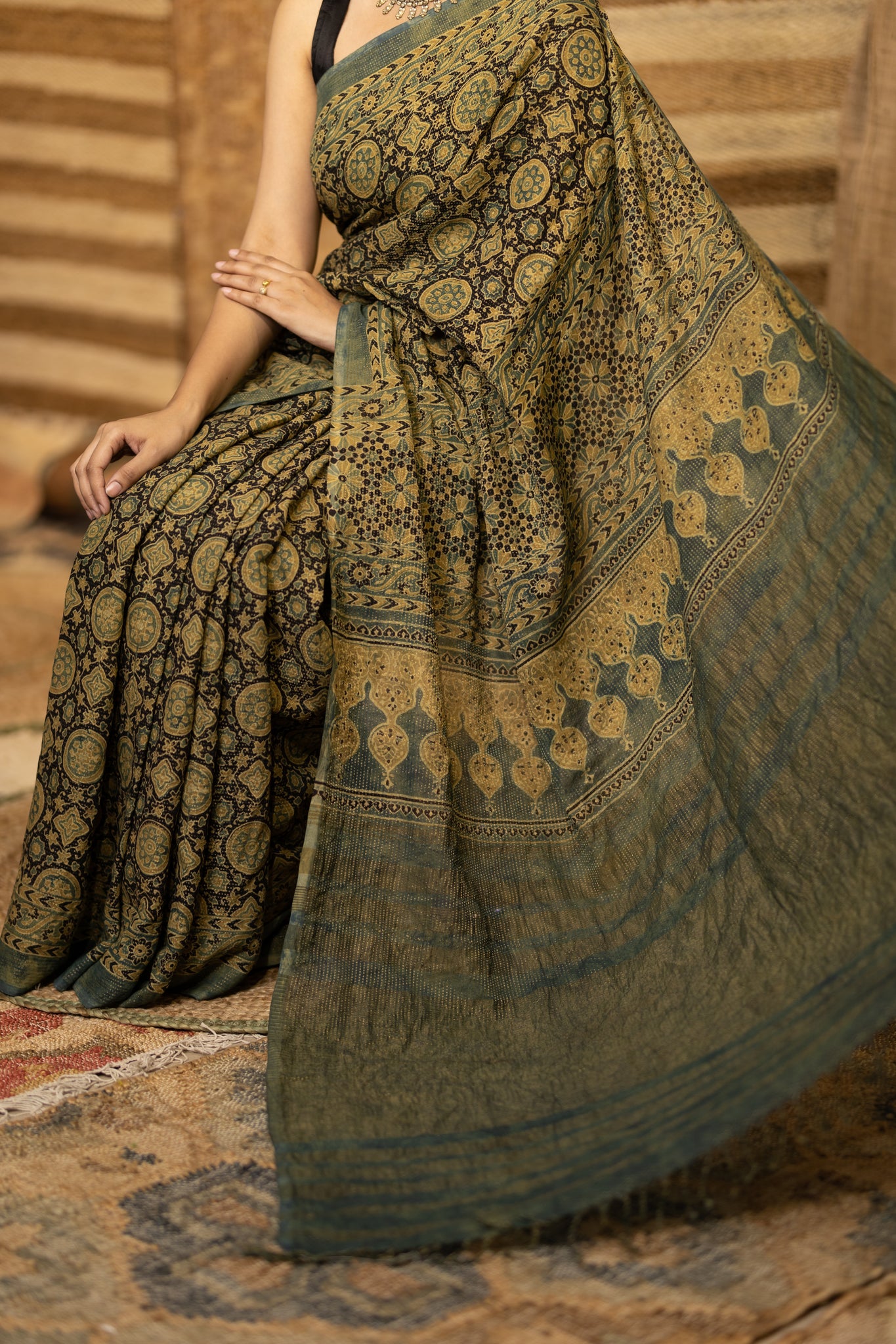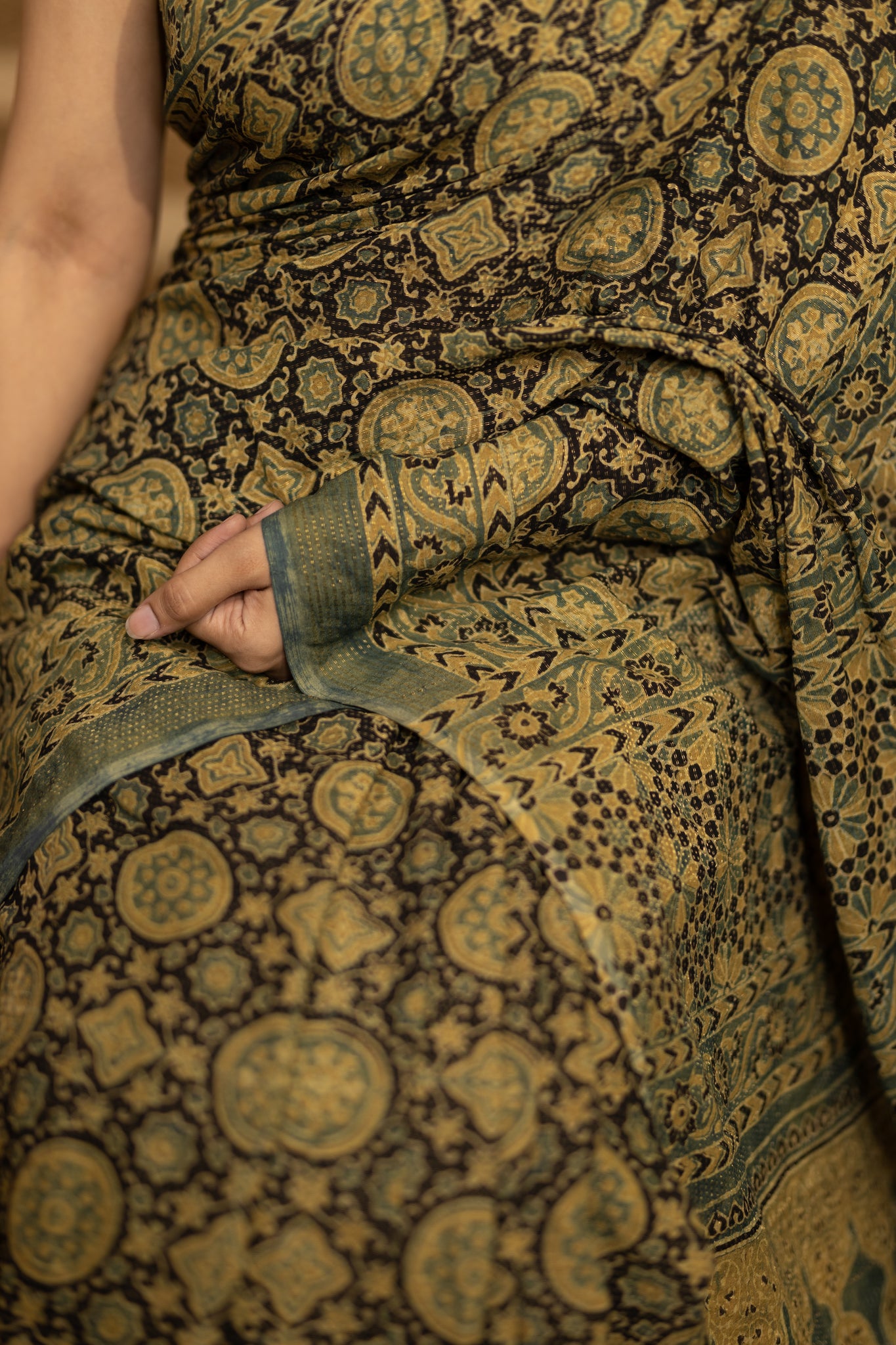 Siya is a cotton based saree with zari mukhda using dobby all over the saree giving it a sheen look crafted with traditional ajrakh block print art.