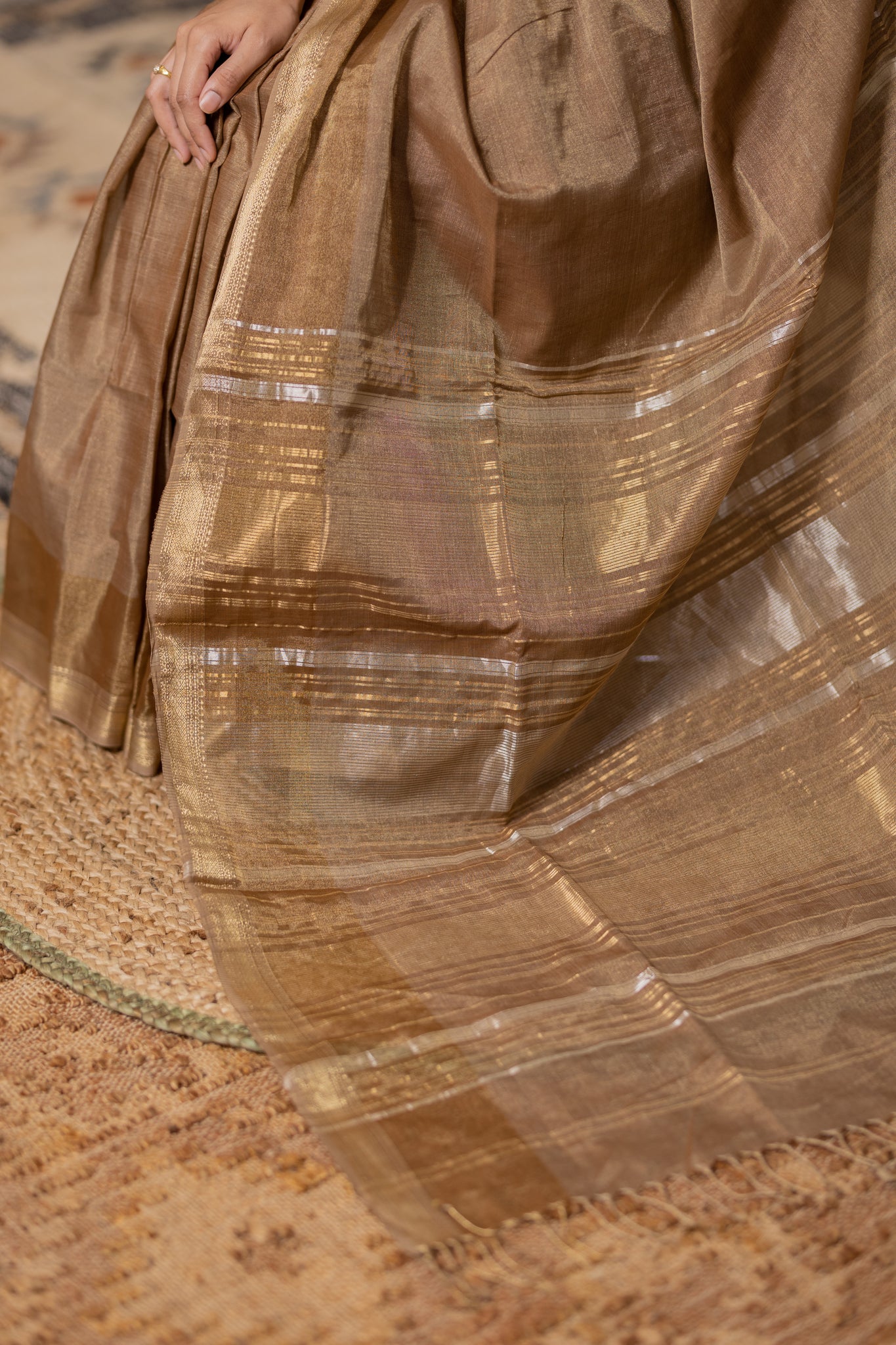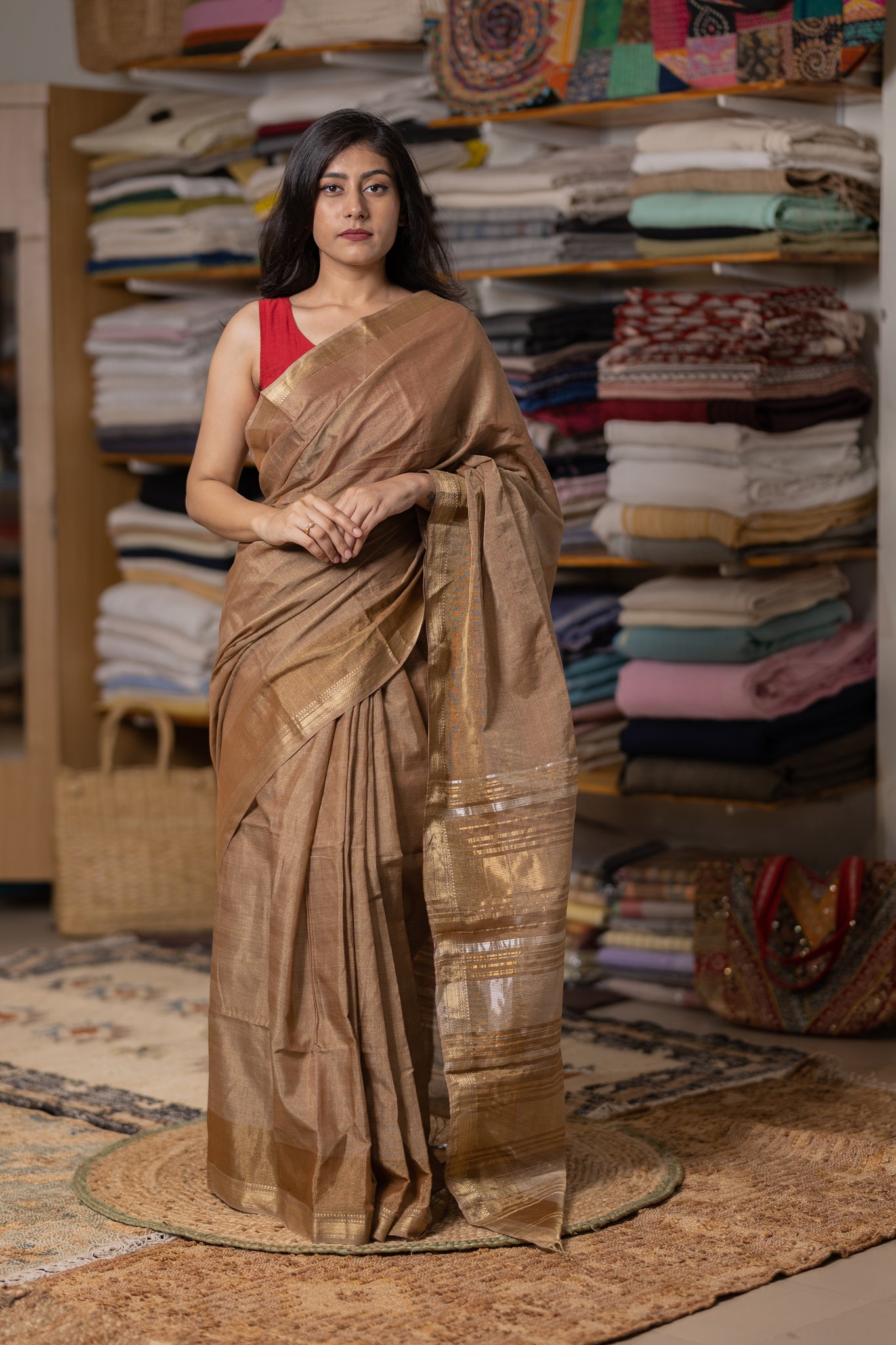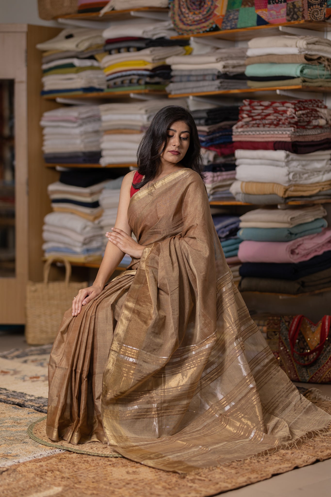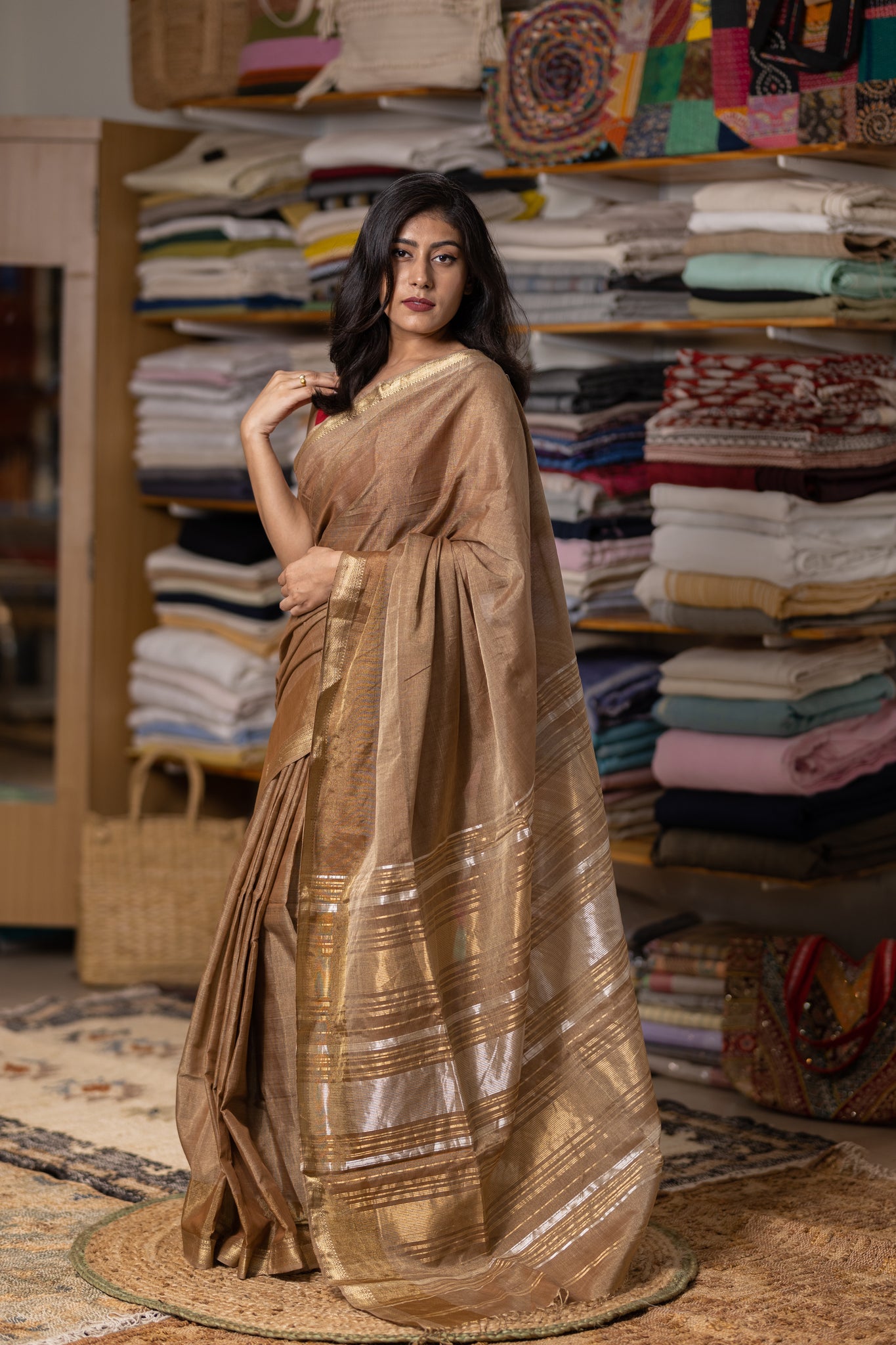 Gauri is maheshwari hand woven cotton saree with zari booti all over the saree and intricate dobby border in silver & golden zari.